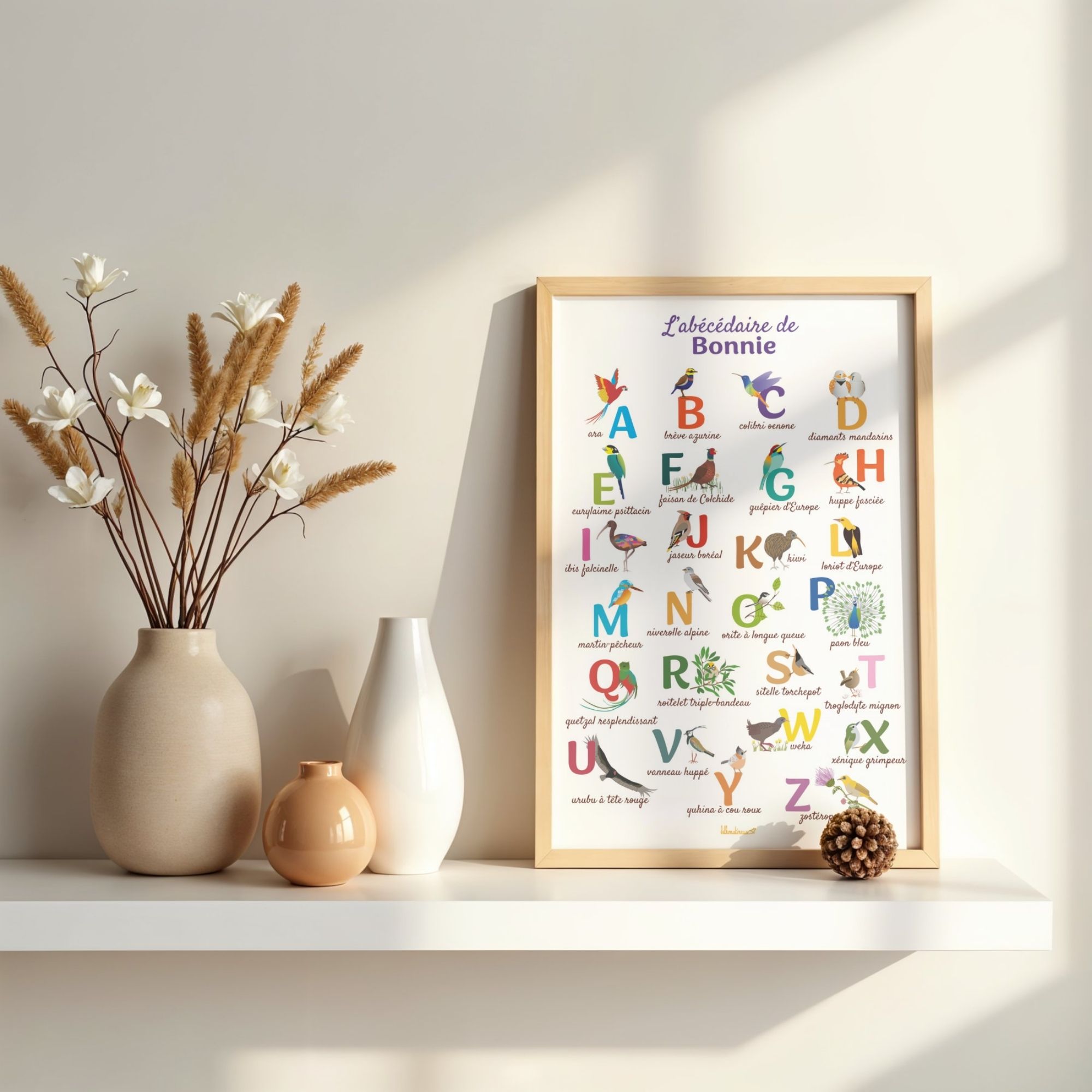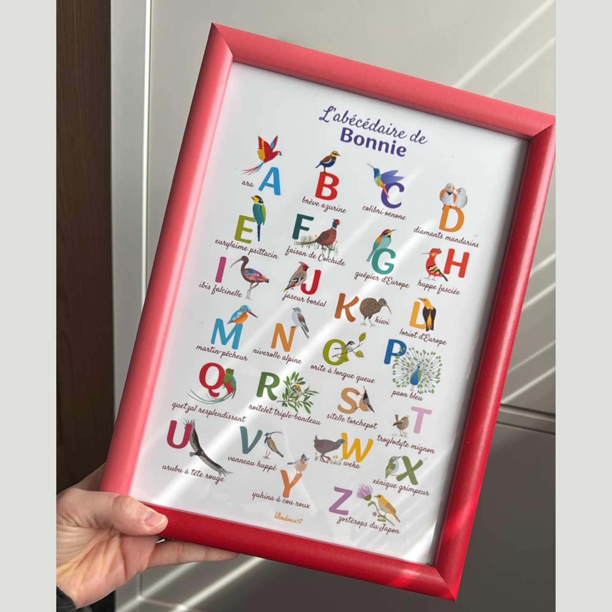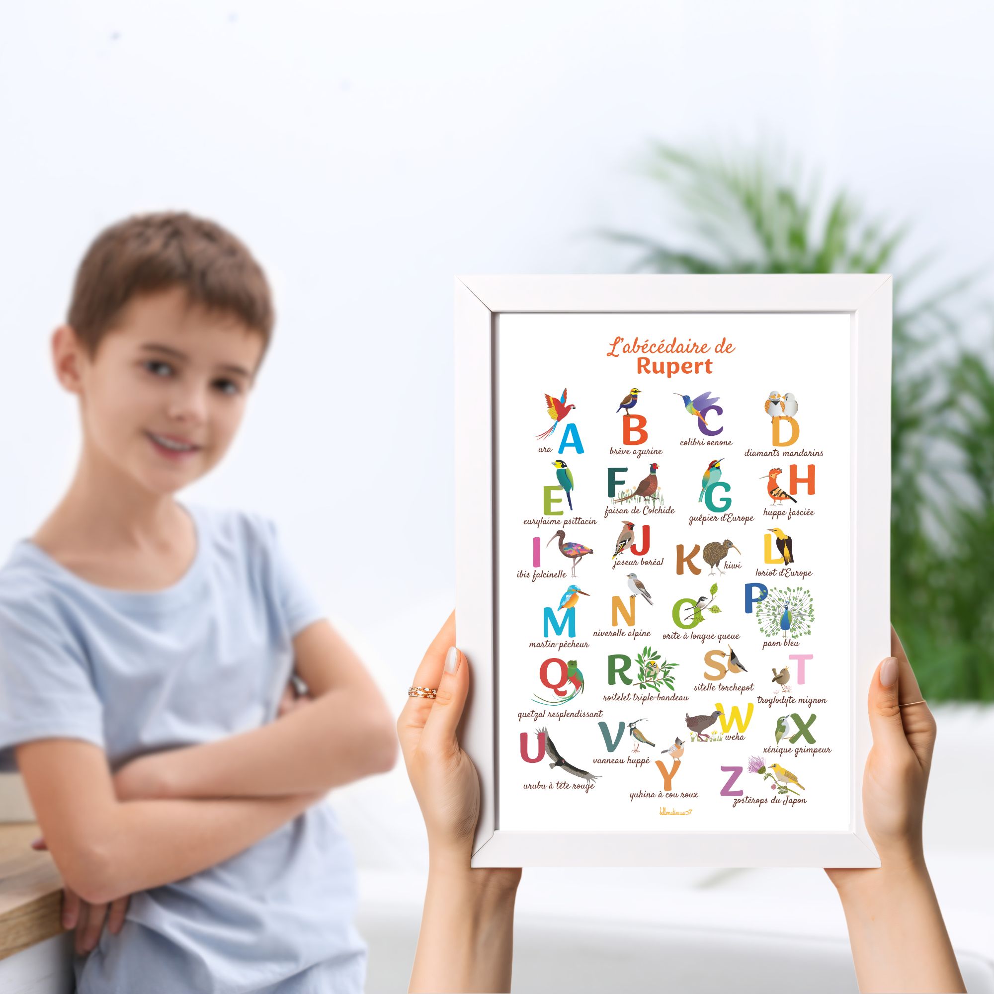 La belle affiche colorée Abécédaire des oiseaux du monde est prête à décorer la chambre de votre enfant (ou petit-enfant) !