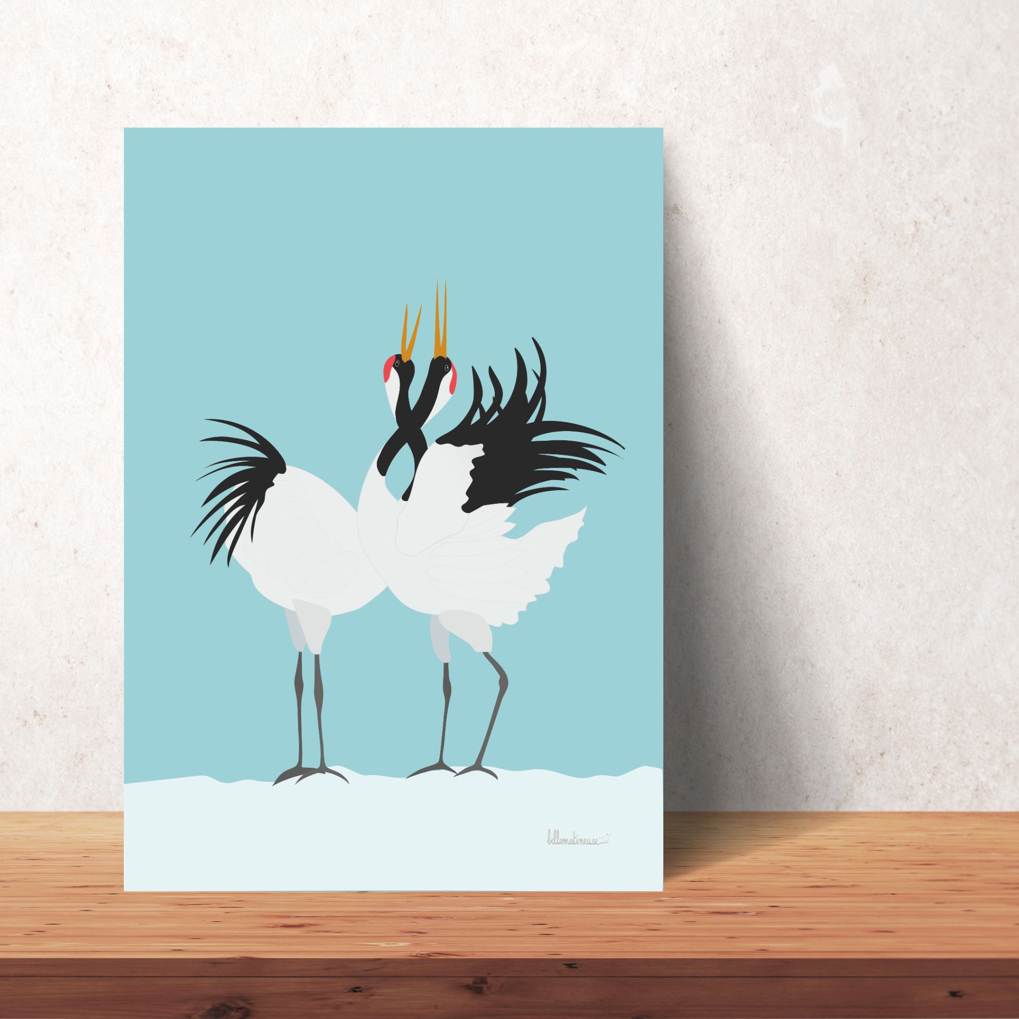 Cette affiche met en scène un couple de grues du Japon : ces oiseaux élégants sont connus pour leur parade nuptiale pleine de grâce.