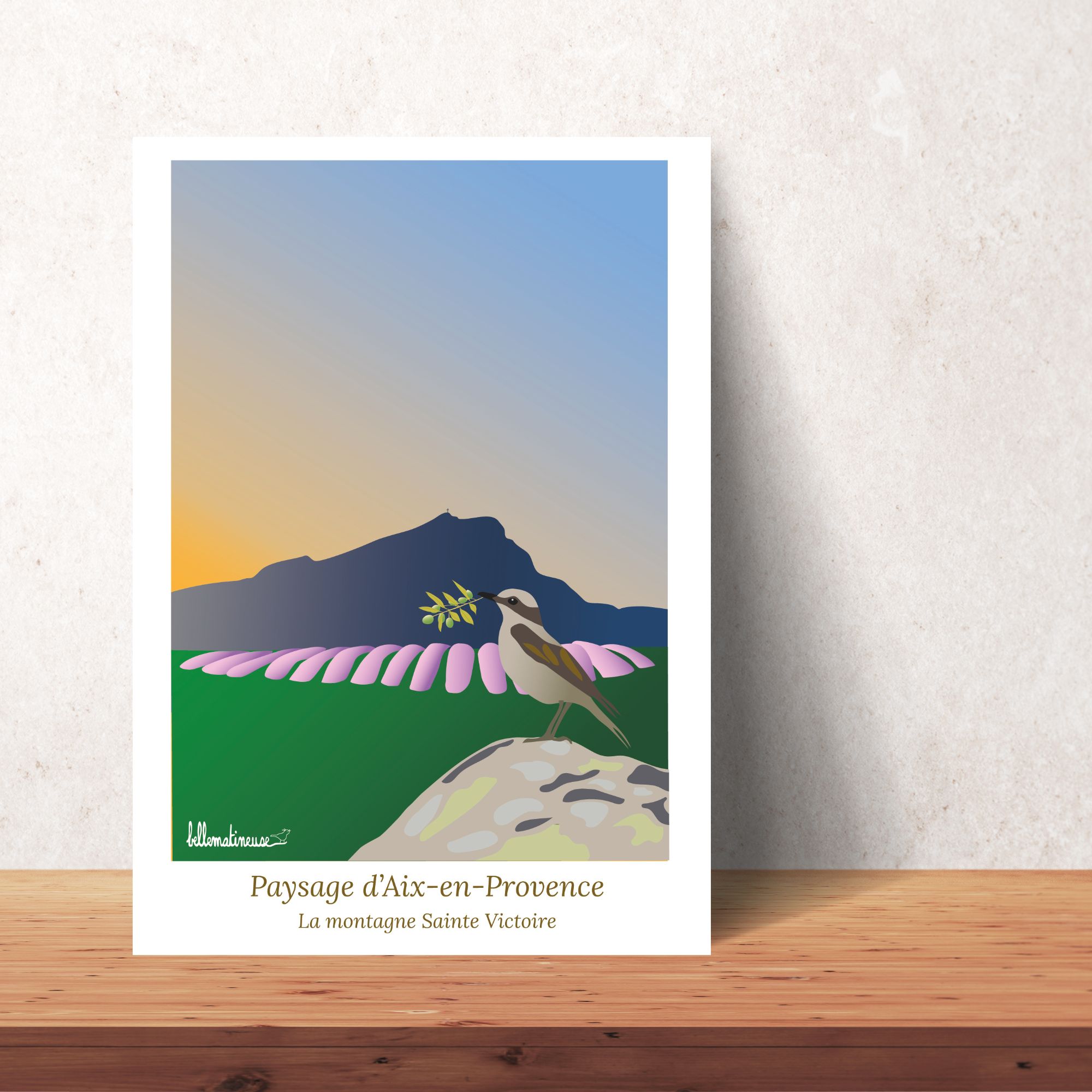 Pour tous les amoureux de la nature, du Sud, et plus particulièrement d’Aix en Provence, cette affiche les contentera ! On peut y admirer la montagne Sainte Victoire qui se détache avec splendeur sur un ciel du matin. Un champ de lavandes ravit nos yeux, et un petit traquet motteux semble vouloir nous tenir compagnie.