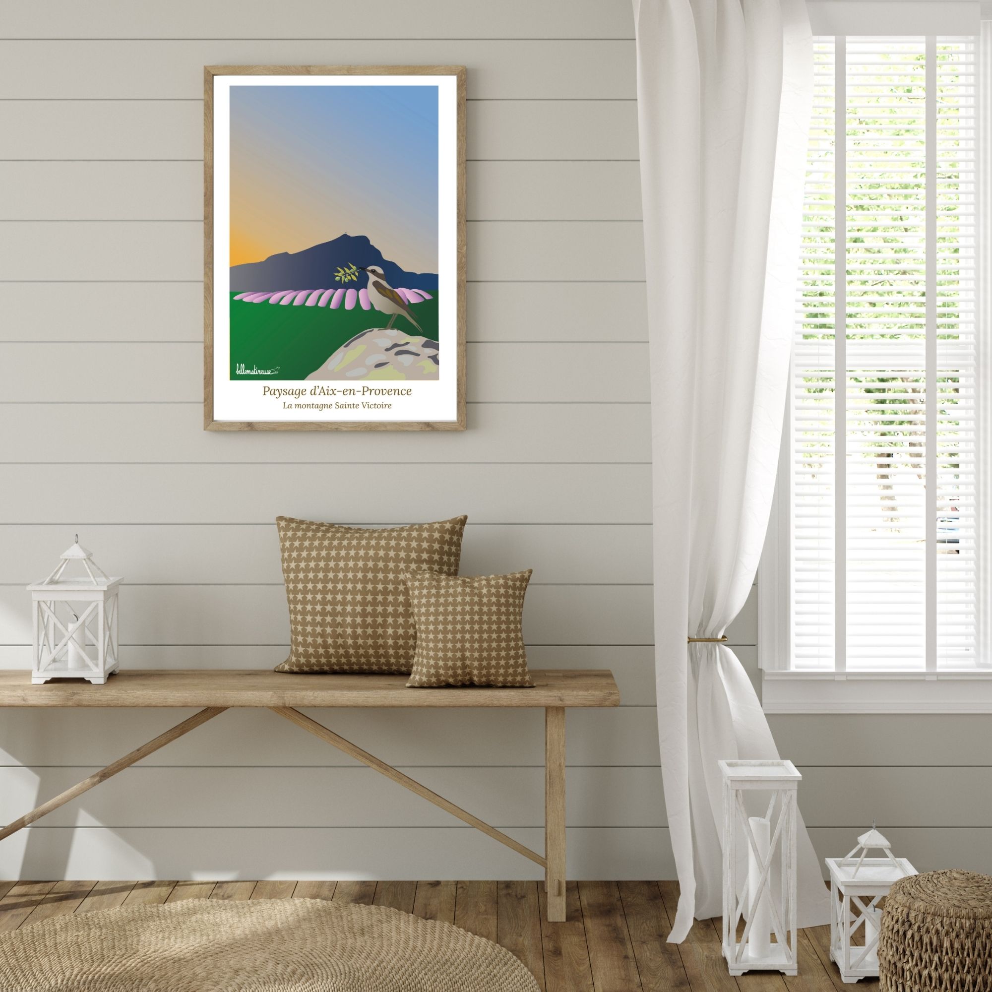 Affiche Paysage du Sud La montagne Sainte Victoire et le traquet motteux