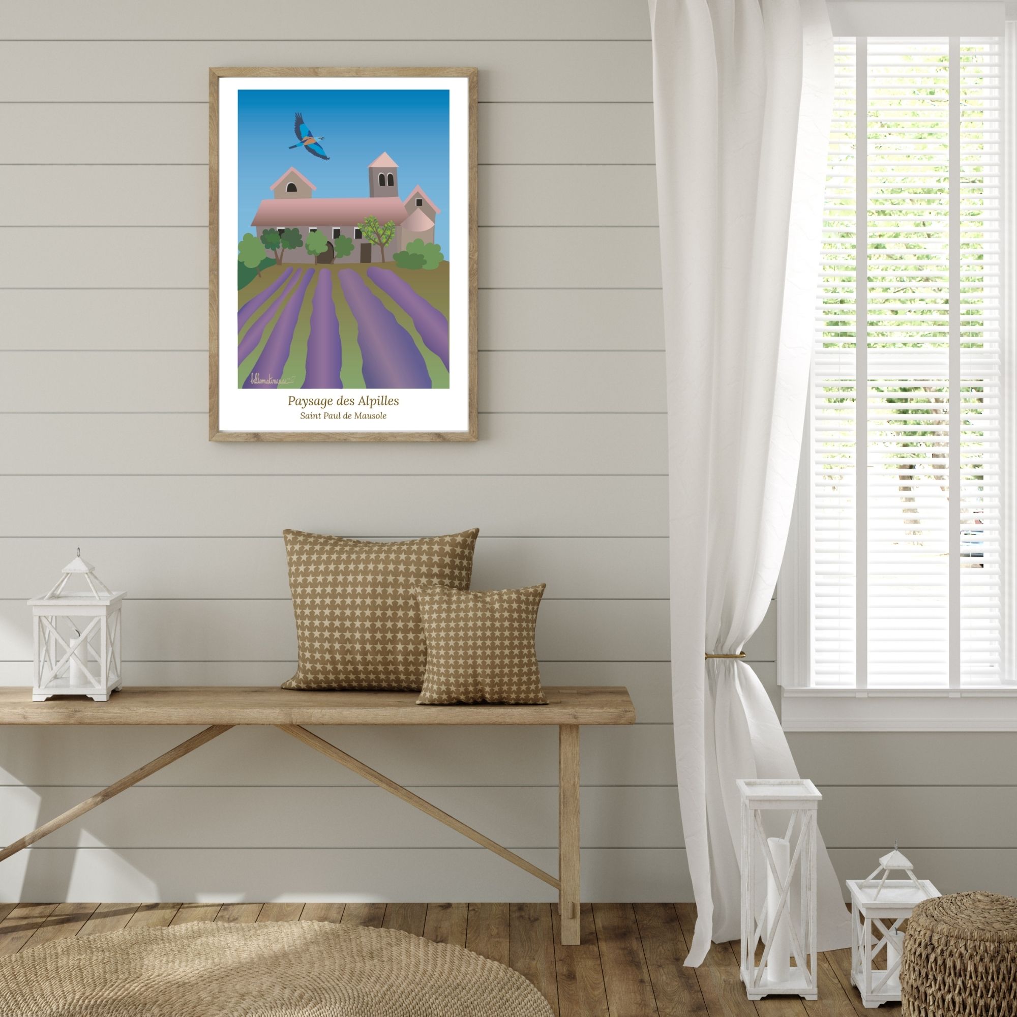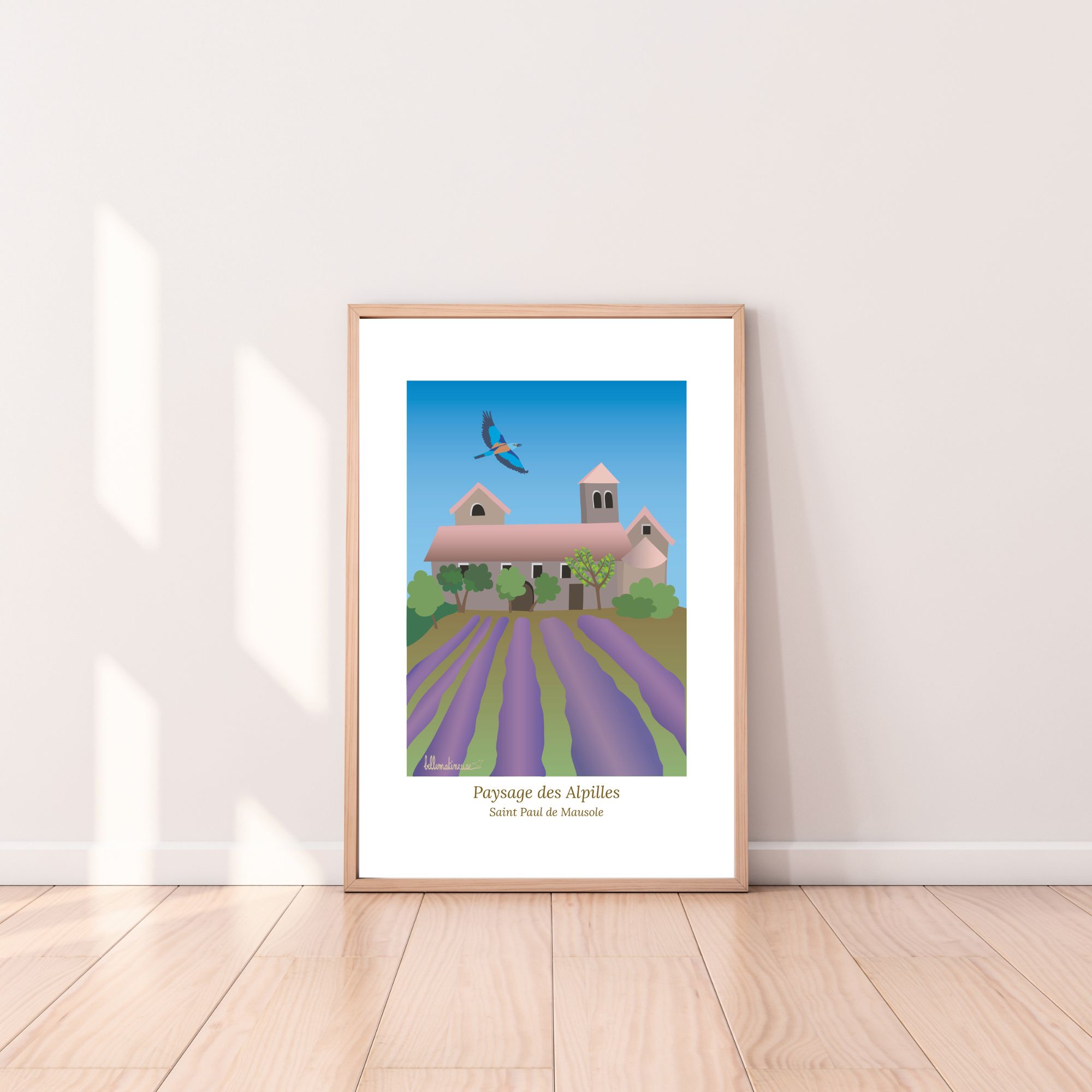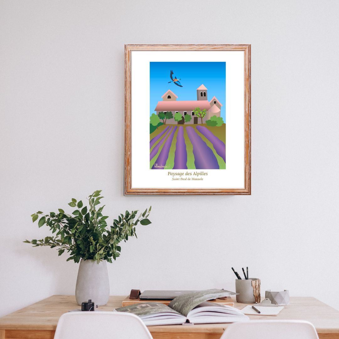 C’est une illustration du monastère Saint Paul de Mausole, situé tout près de Saint Rémy de Provence, à la saison des lavandes. Un endroit empreint d’histoire (le peintre Vincent Van Gogh y a séjourné un an en 1889) et de calme. Un magnifique rollier survole le site, ajoutant une belle note poétique.