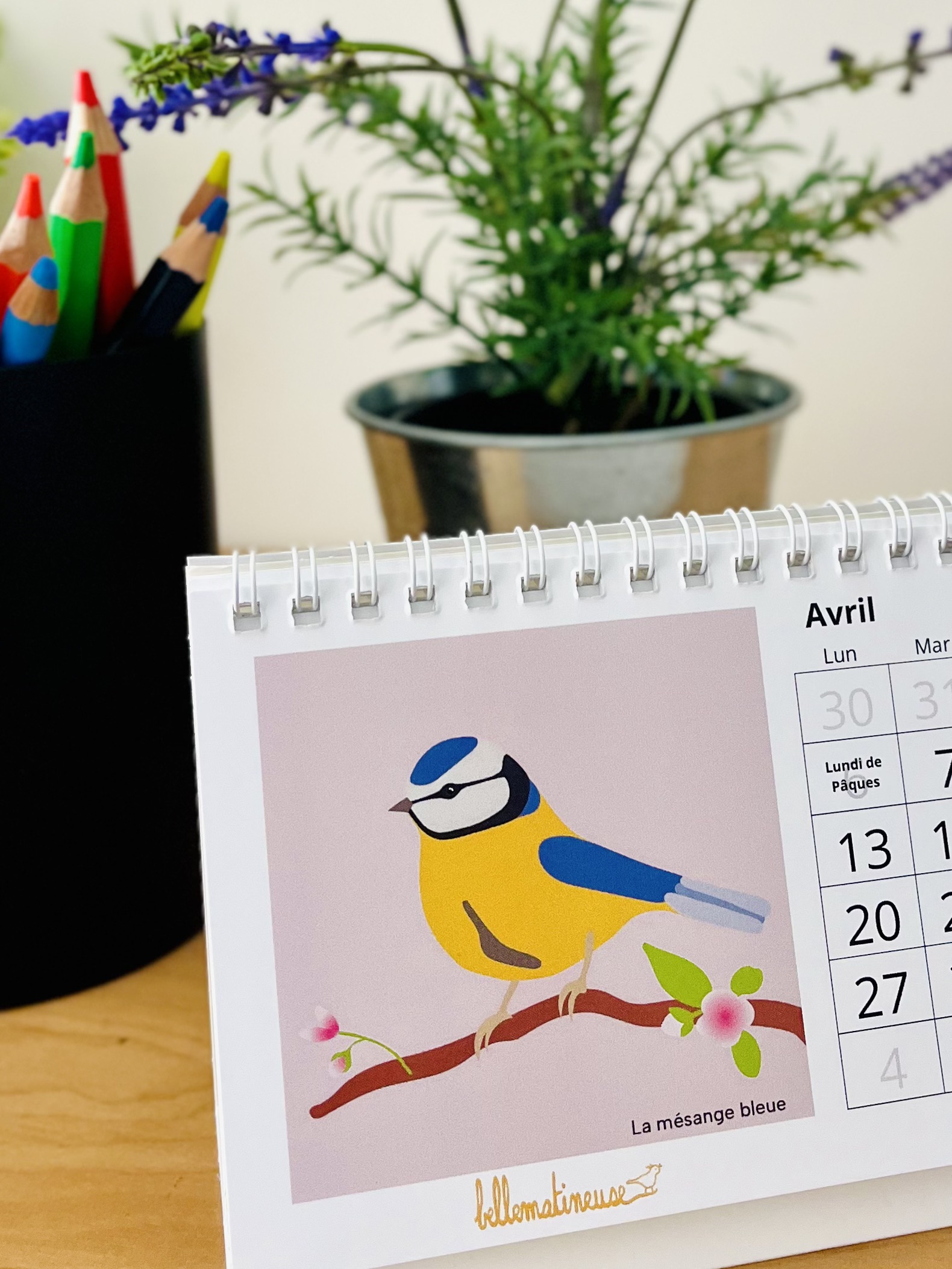 Il contient douze oiseaux du jardin, que j’ai soigneusement choisis pour représenter les différents mois de l’année. Les illustrations ont été réalisées par moi-même, et j’ai à cœur d’utiliser de belles couleurs vibrantes pour communiquer joie de vivre et sérénité. Une façon originale de rester connecter au rythme de la nature toute l’année !